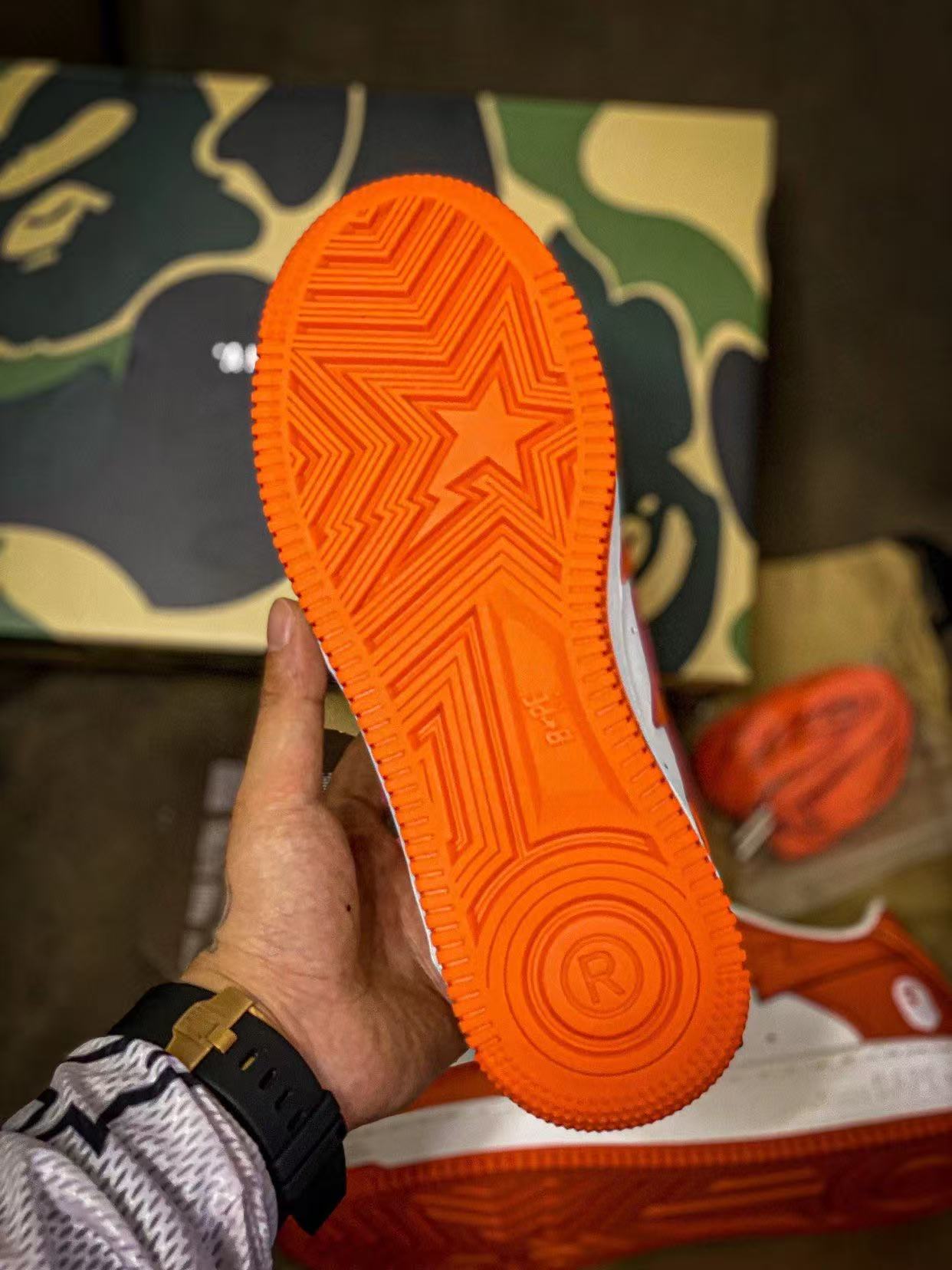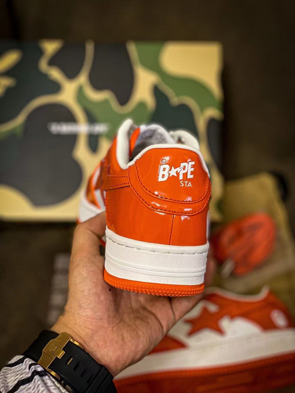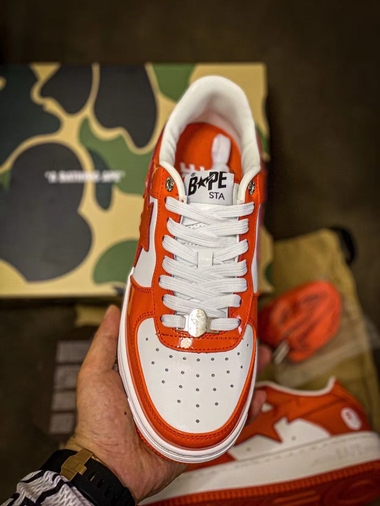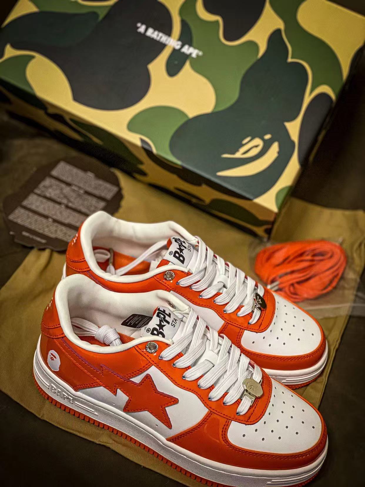 Bape STA Low 白橘 漆皮 低帮板鞋 原樘原纸版开发版型 采用进口漆皮及纹牛剖皮革材质鞋面 鞋垫嵌入Ortholite(欧索菜)缓震材质 附带送一副高密度迷彩替换鞋垫 外置橡胶大底 天花板级别品质