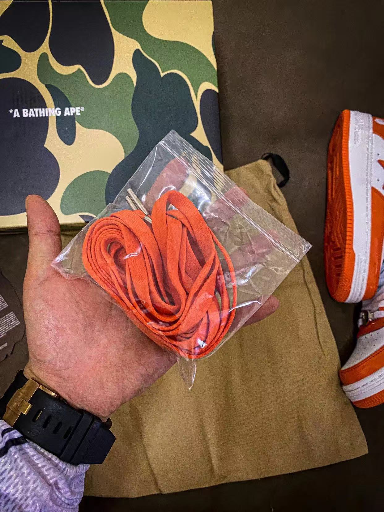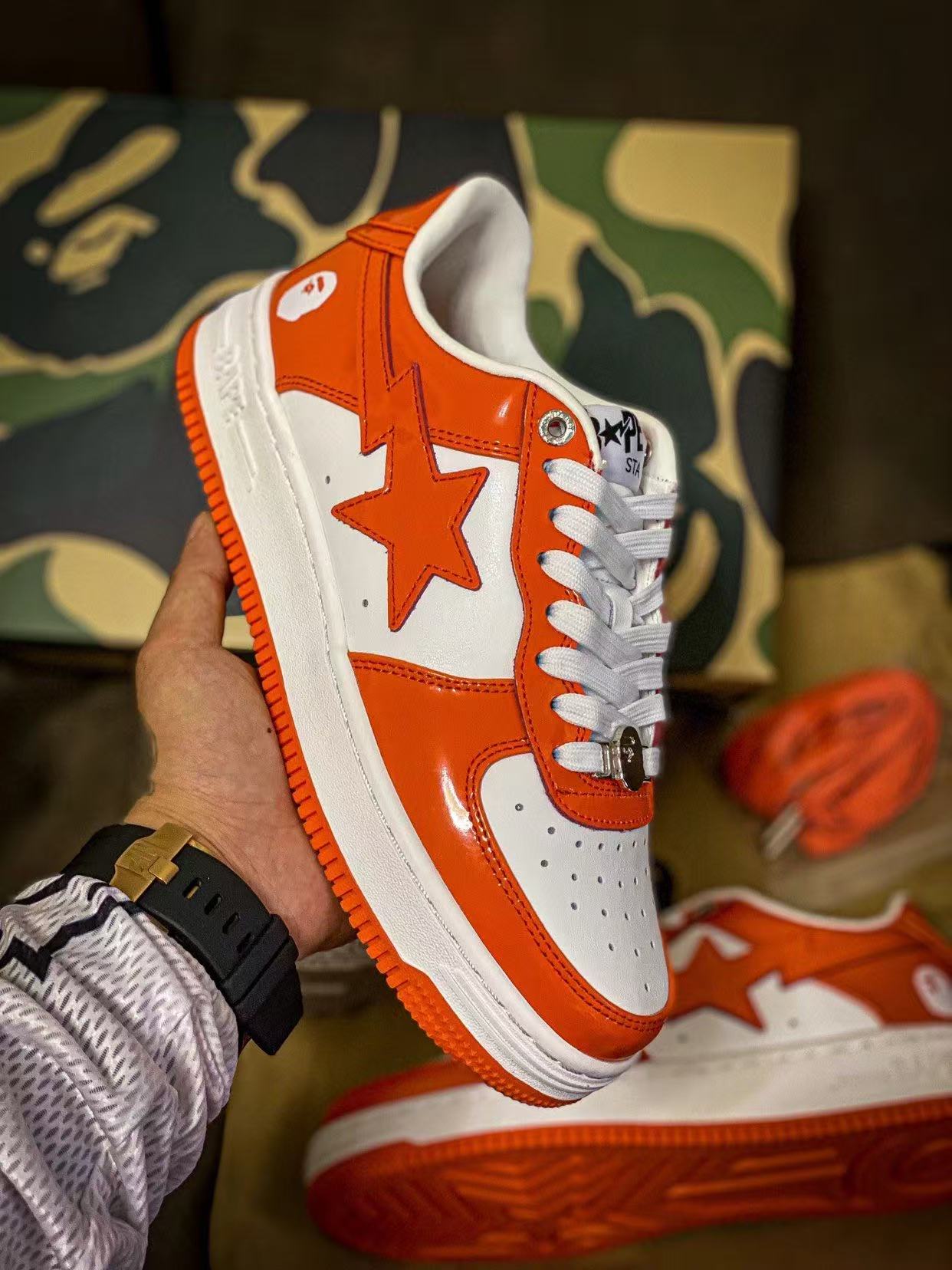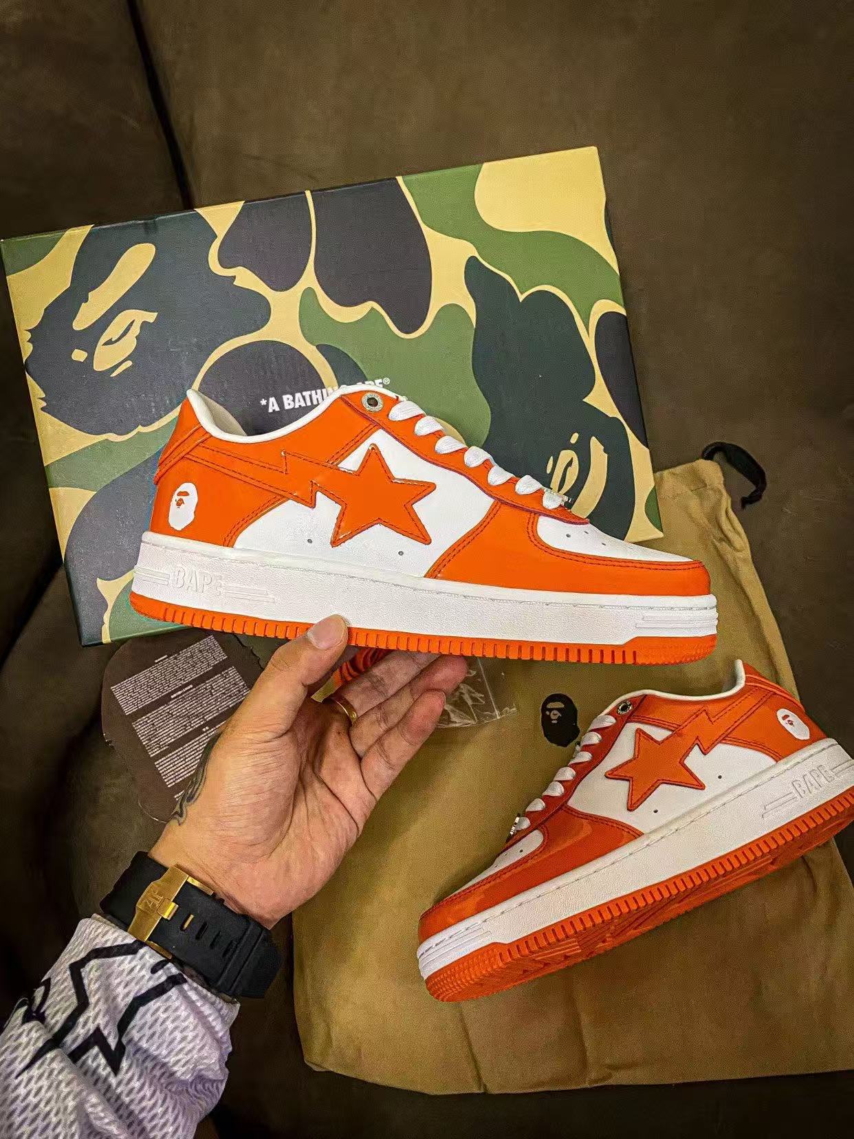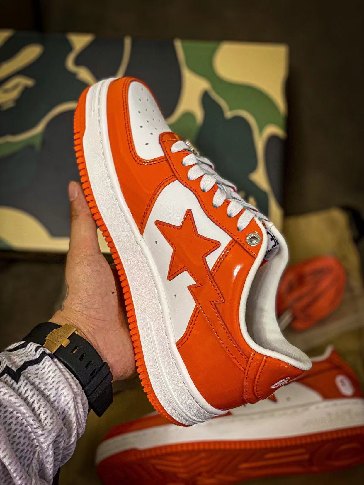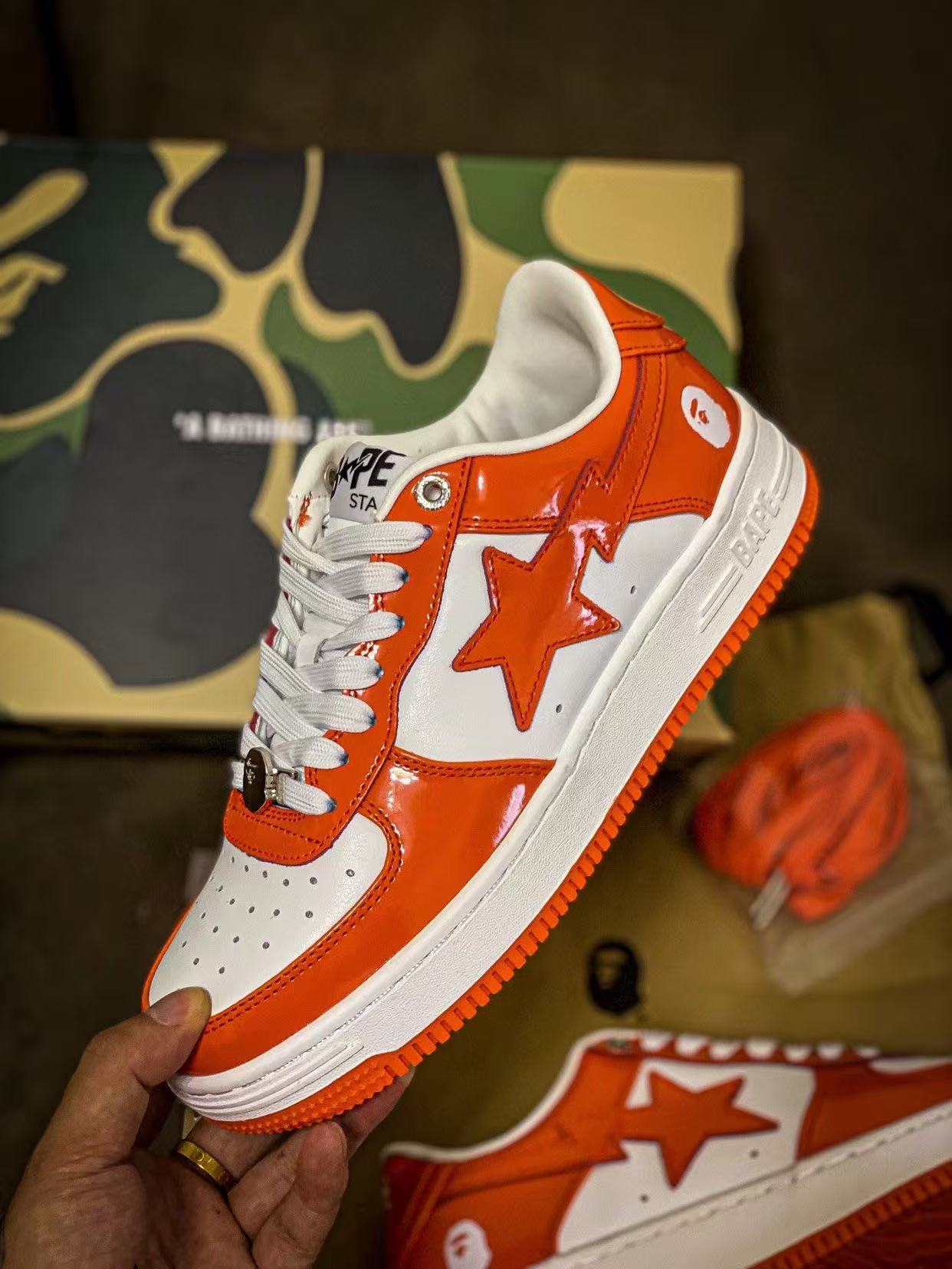 Bape STA Low 白橘 漆皮 低帮板鞋 原樘原纸版开发版型 采用进口漆皮及纹牛剖皮革材质鞋面 鞋垫嵌入Ortholite(欧索菜)缓震材质 附带送一副高密度迷彩替换鞋垫 外置橡胶大底 天花板级别品质