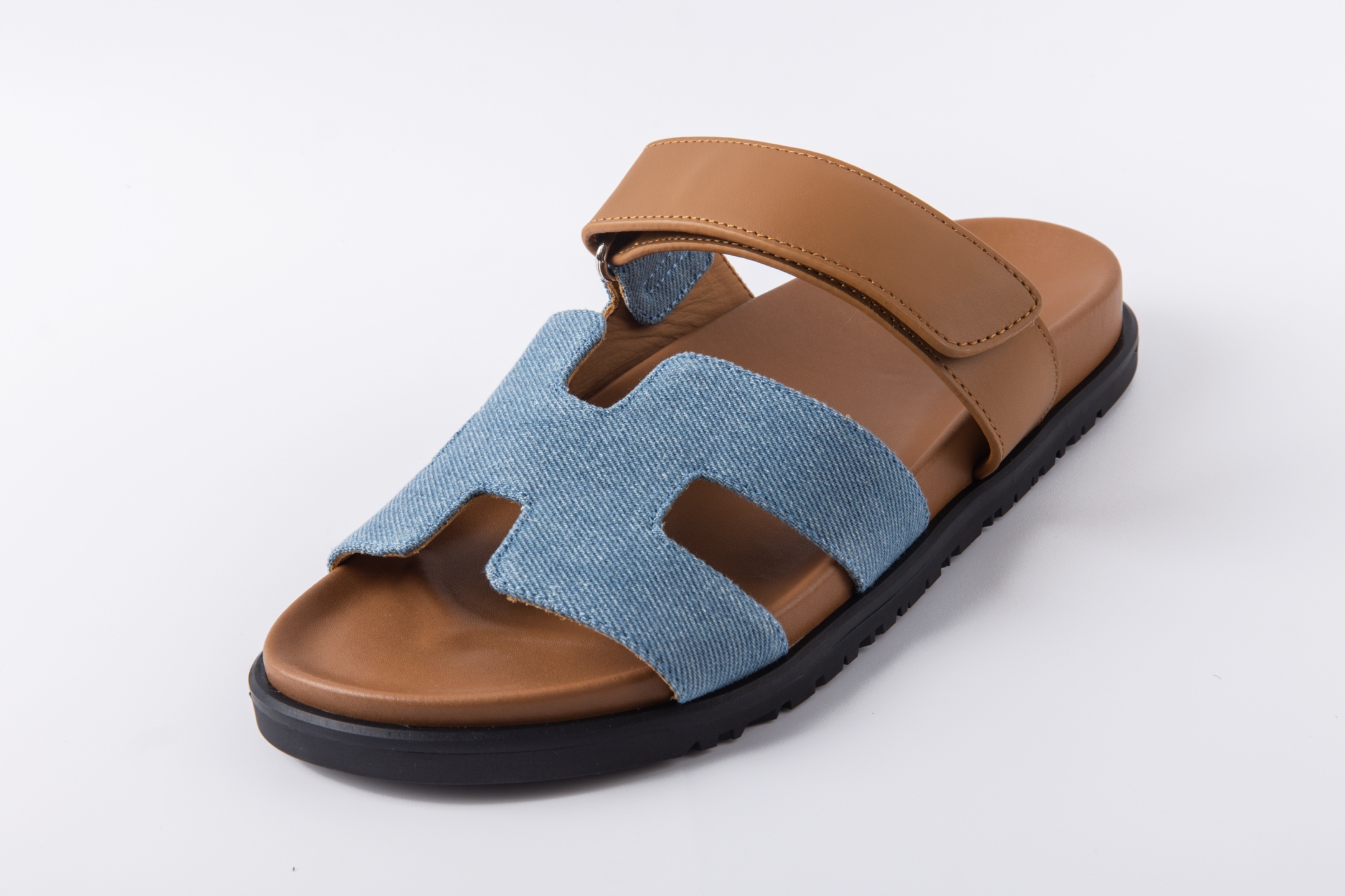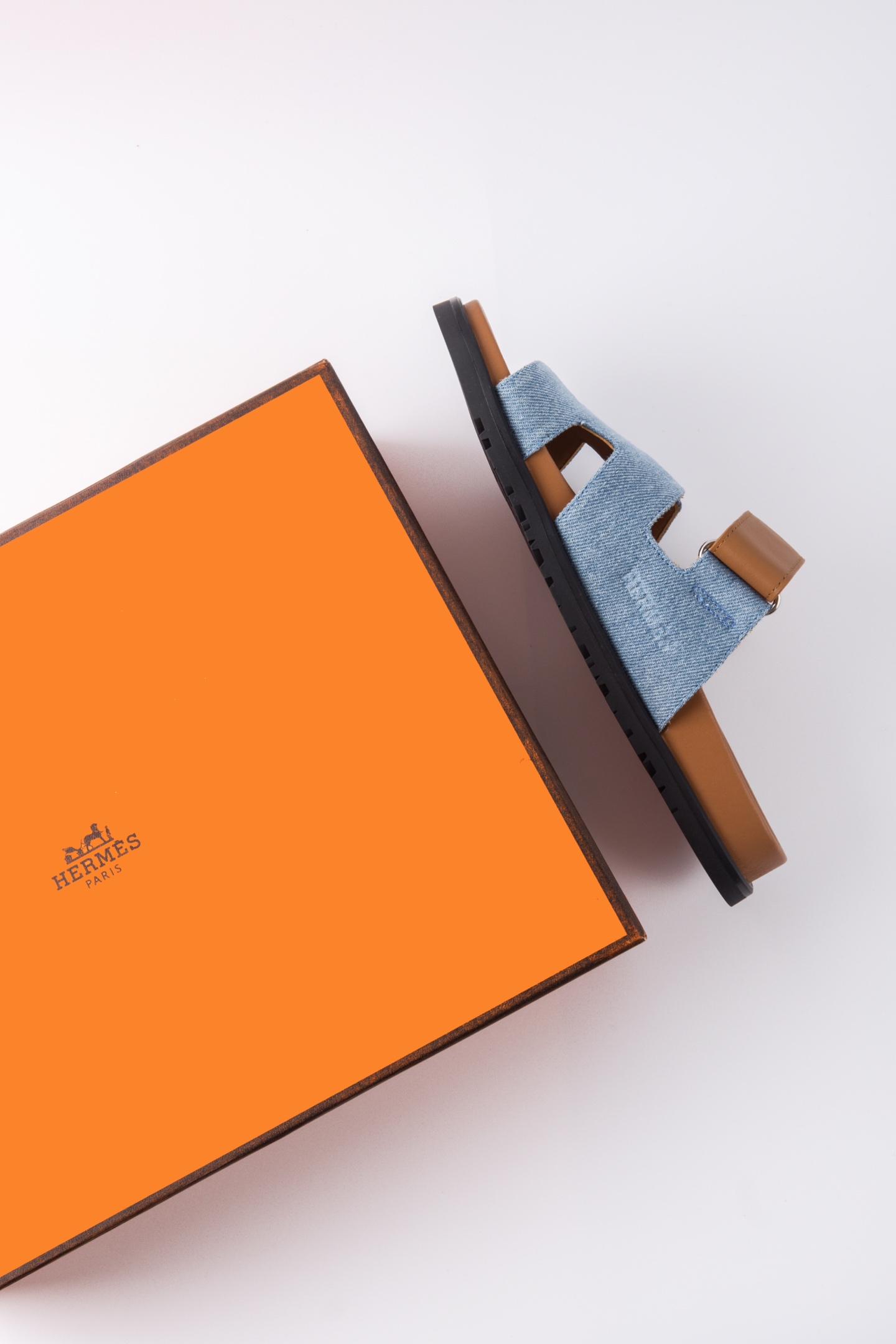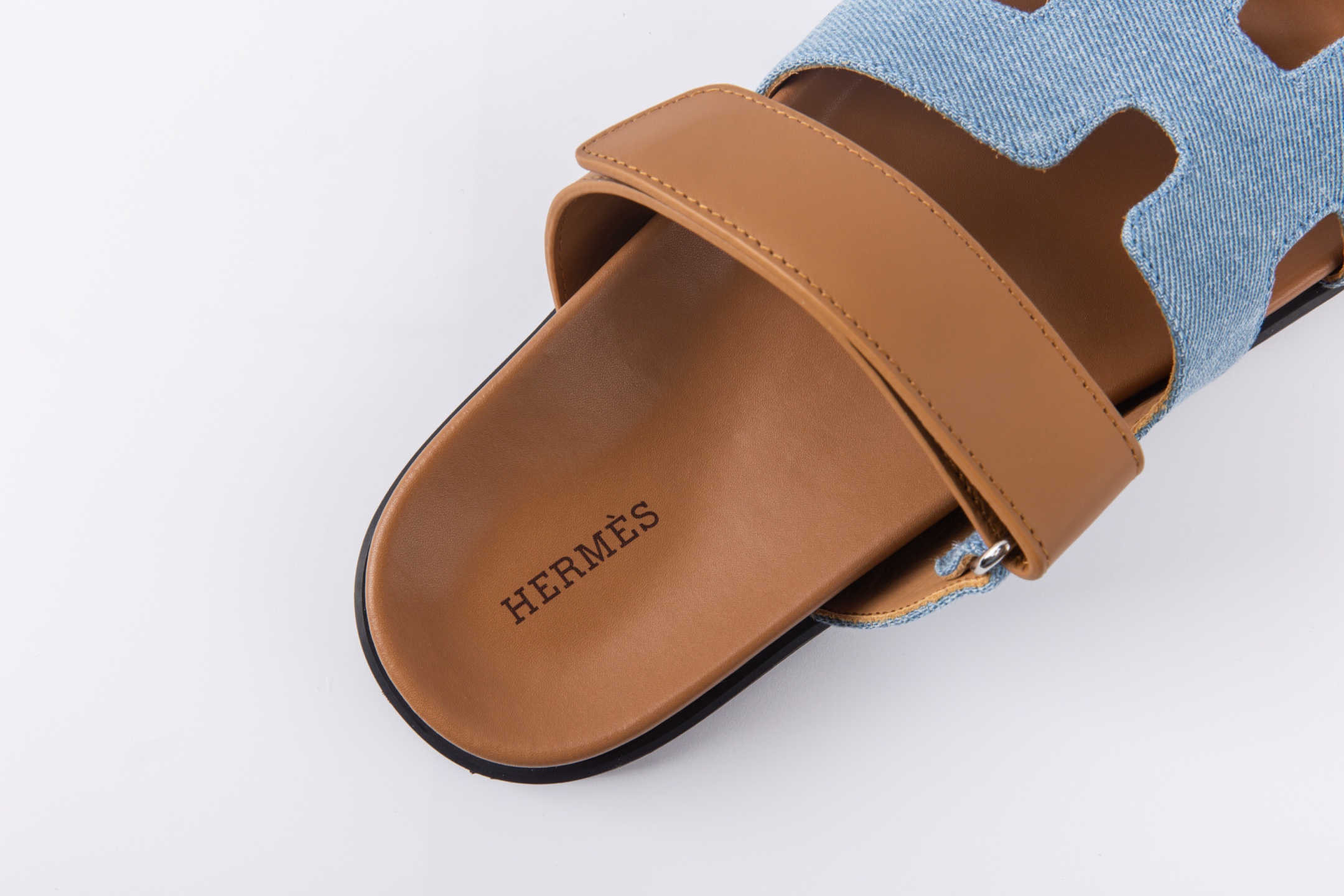Hermes愛馬仕lzmir 二舅拖鞋H拖 咖色皮拼藍牛仔