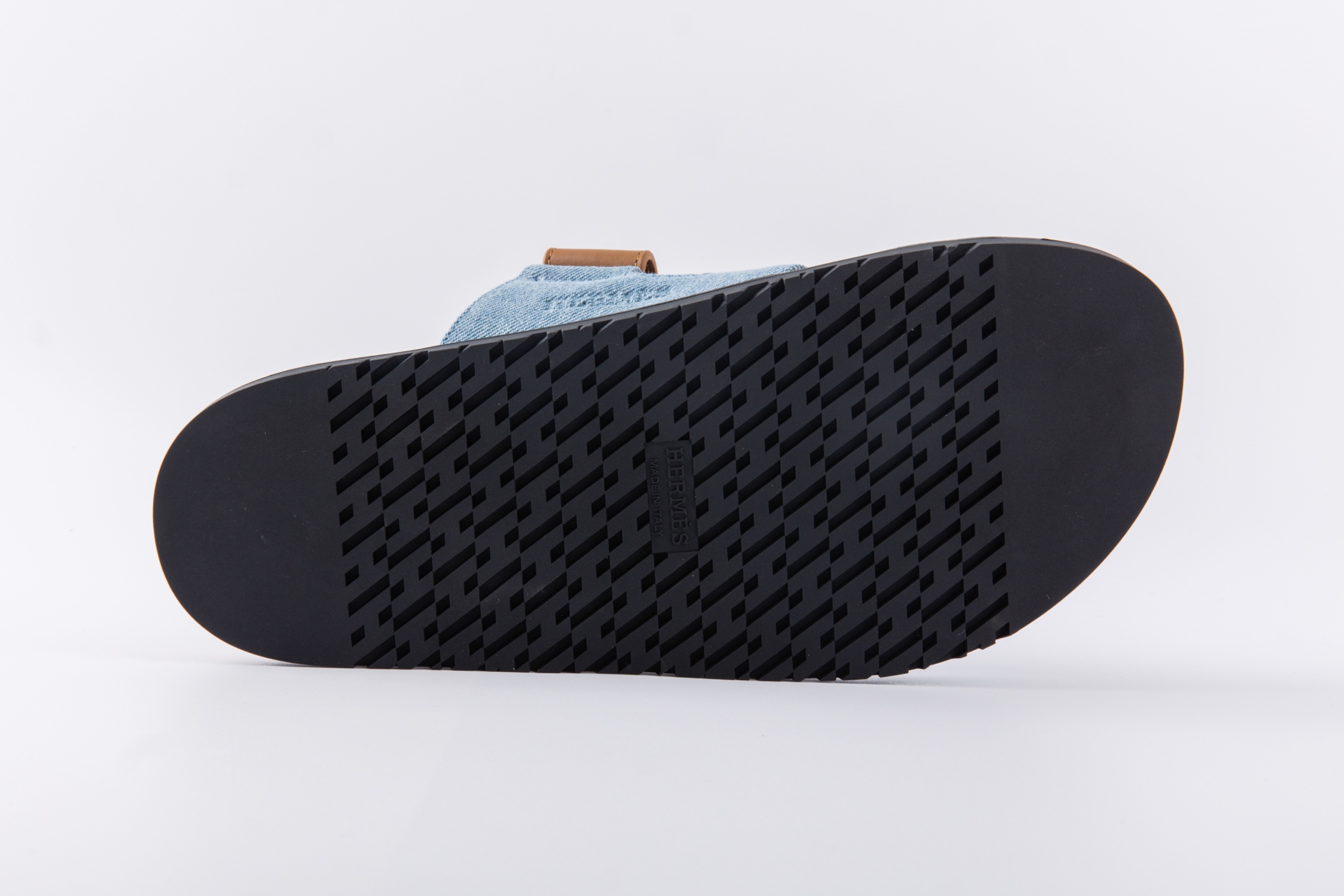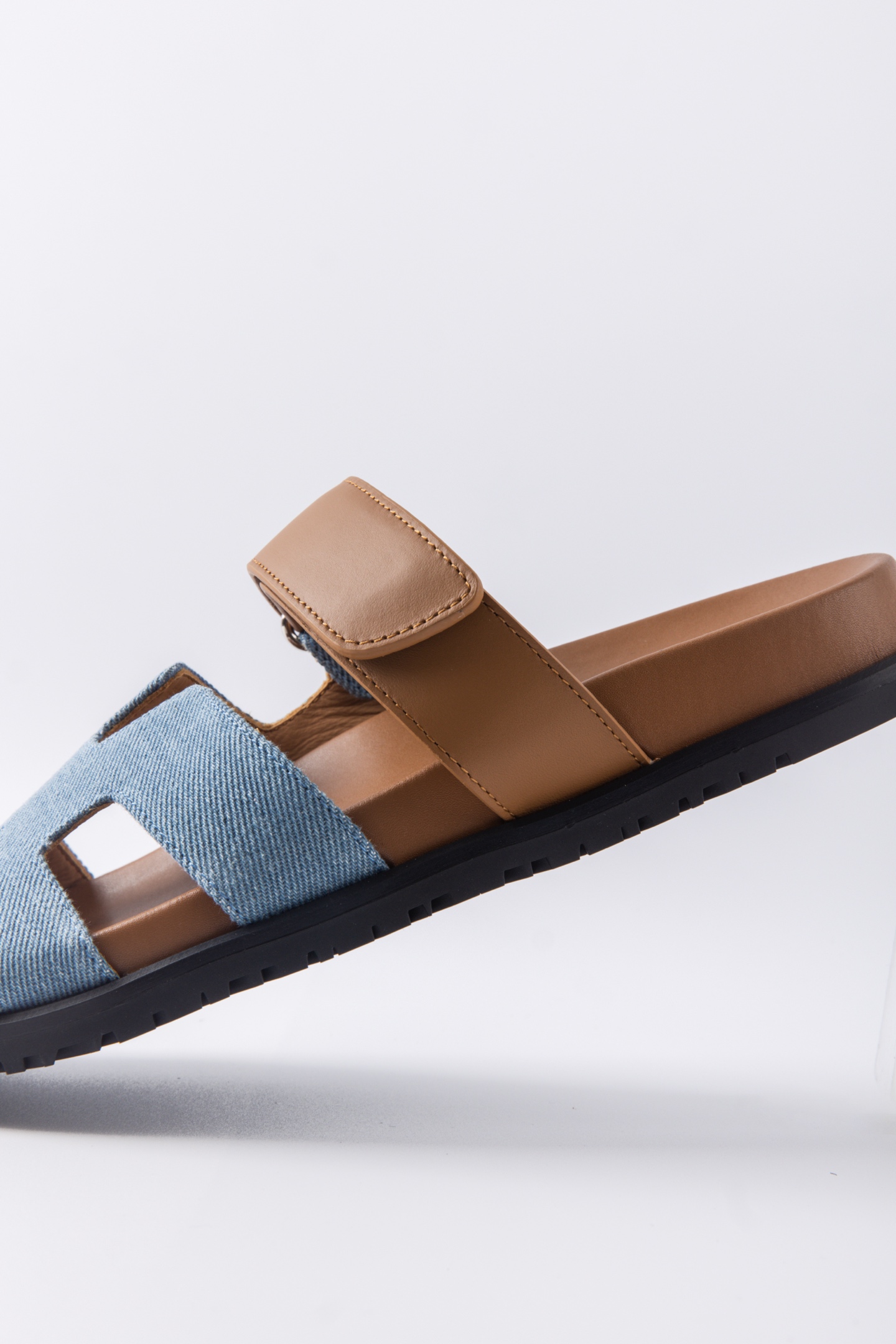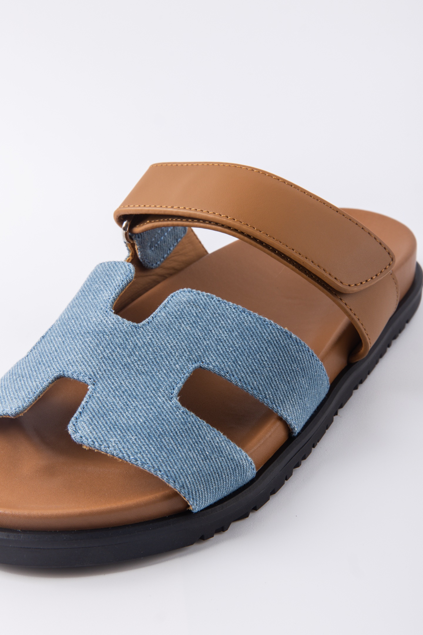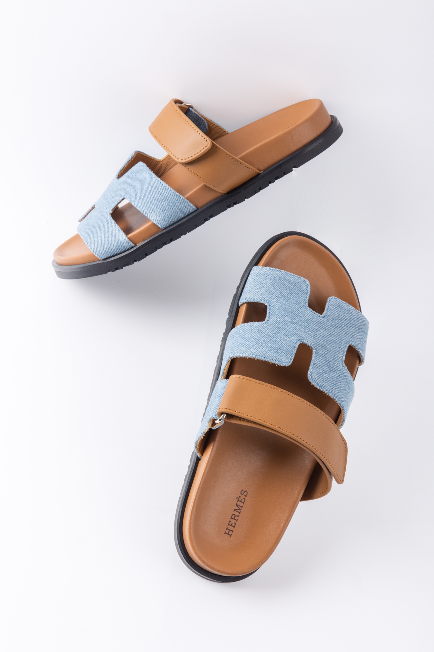 Hermes愛馬仕lzmir 二舅拖鞋H拖 咖色皮拼藍牛仔
